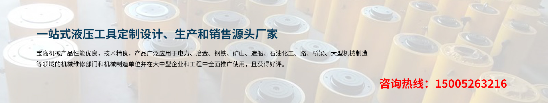 泰州市寶島機械制造有限公司位于長江三角洲著名的工具制造基地 -- 江蘇泰州。京滬、寧通高速公路,新長、寧啟鐵路貫穿全境。交通運輸條件十分便利。 BDYYJX寶島機械制造公司專業生千斤頂、液壓千斤頂、電動液壓千斤頂、大噸位千斤頂、薄型千斤頂、橋梁千斤頂、同步液壓千斤頂、空心千斤頂、自鎖式千斤頂;液壓螺母、液壓螺栓拉伸器;液壓扳手、電動(手動)液壓扳手;液壓彎管機、電動(手動)液壓彎管機、液壓彎排機;試壓泵、電動試壓泵;軸承加熱器、微電腦軸承加熱器、感應拆卸器;液壓拉馬(拔輪器)、電動小車式升降液壓拉馬;螺帽破切器、液壓沖孔機、液壓平彎機、液壓開孔器、母線加工機、電動液壓升降(平臺)機等液壓工具。 是國內液壓機電業配套的綜合性企業,服務于國內各類大中型企業。 寶島機械產品性能優良,技術精良,產品廣泛應用于電力、冶金、鋼鐵、礦山、造船、石油化工、路、橋梁、大型機械制造等領域的機械維修部門和機···